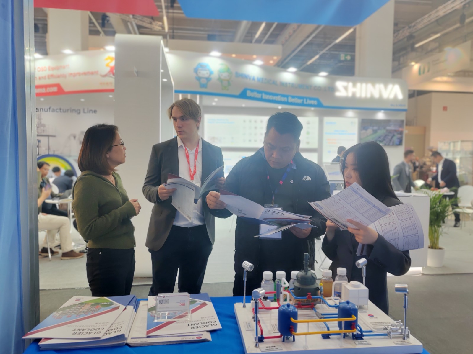 在展会现场,冰河集团展位以“技术创新+品质保障”为核心,成为吸引国际客户的焦点阵地。我们重点呈现符合欧美药典标准的产品,通过工艺流程图、质量检测报告等可视化资料,全方位解码从研发到生产的全链条管控能力;同时为德国、北欧等地区客户提供定制化解决方案咨询,精准响应不同市场的合规要求与应用场景需求。